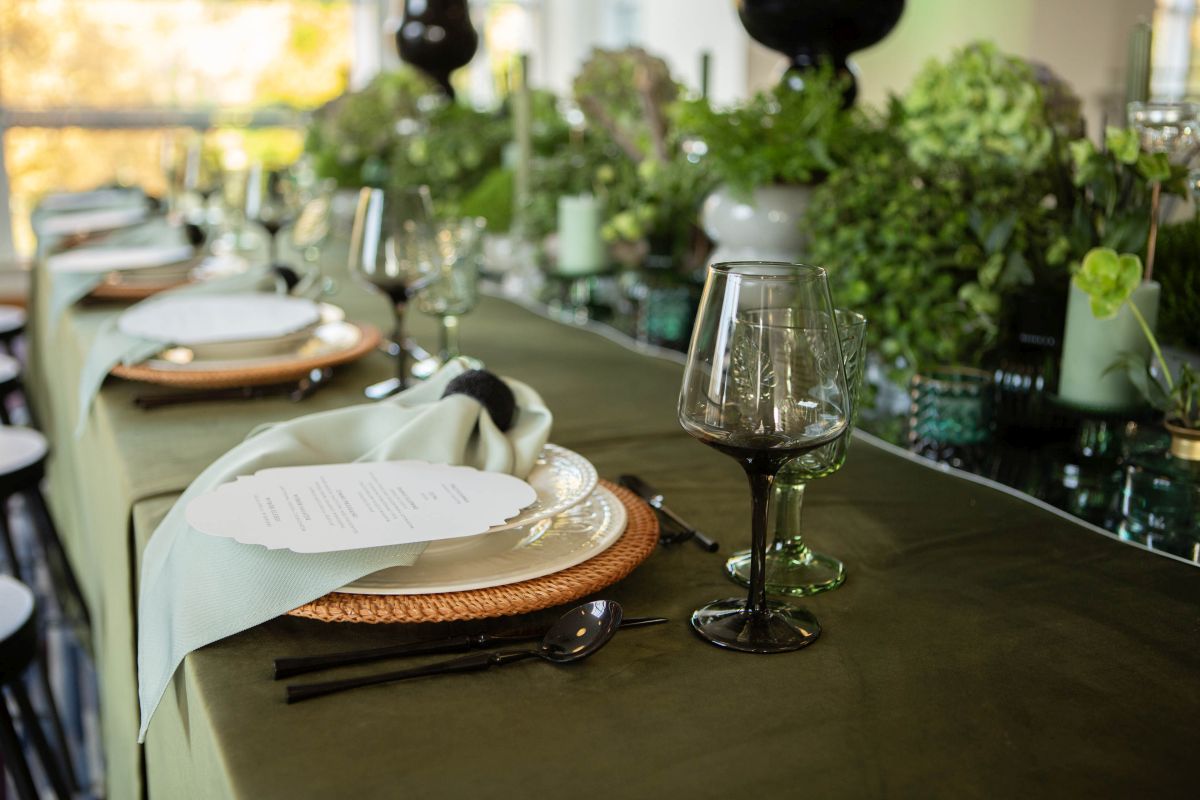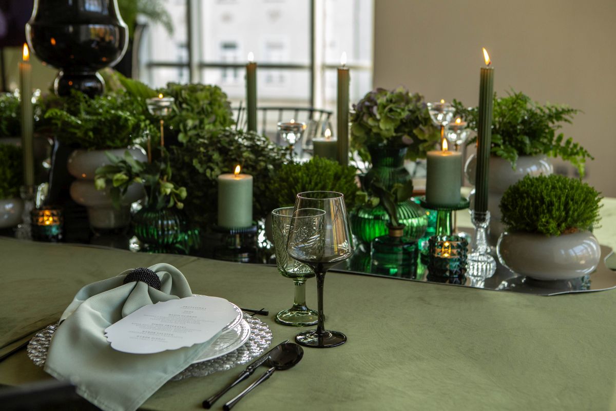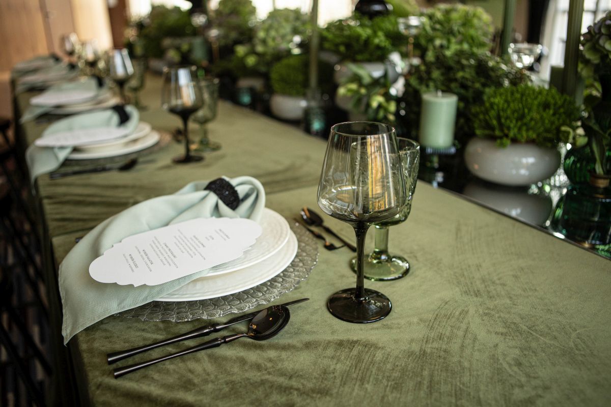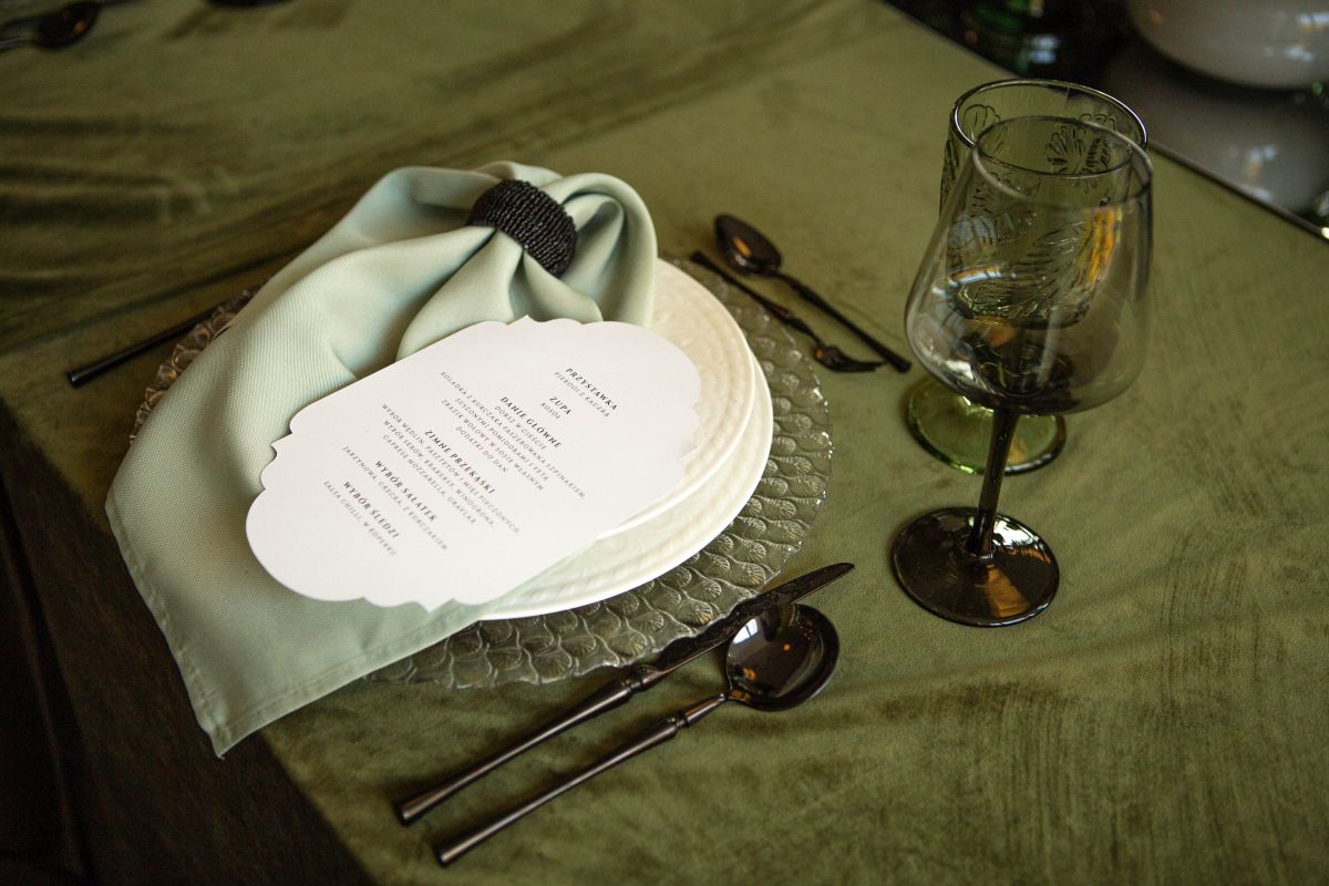 Ta dekoracja ślubna to wyjątkowa aranżacja kameralnego przyjęcia, w której dominują zmysłowe odcienie zieleni, elegancja detalu i harmonia natury. Na tle welurowego, oliwkowego obrusu wyeksponowano elegancką zastawę: szklane talerze z fakturą, czarne sztućce i kieliszki o subtelnie zdobionym szkle w butelkowym odcieniu. Miękka, pistacjowa serwetka z ozdobną obrączką dopełnia stylizacji, nadając nakryciu finezyjny charakter. Do tego eleganckie menu zaprojektowane przez Mrs Design