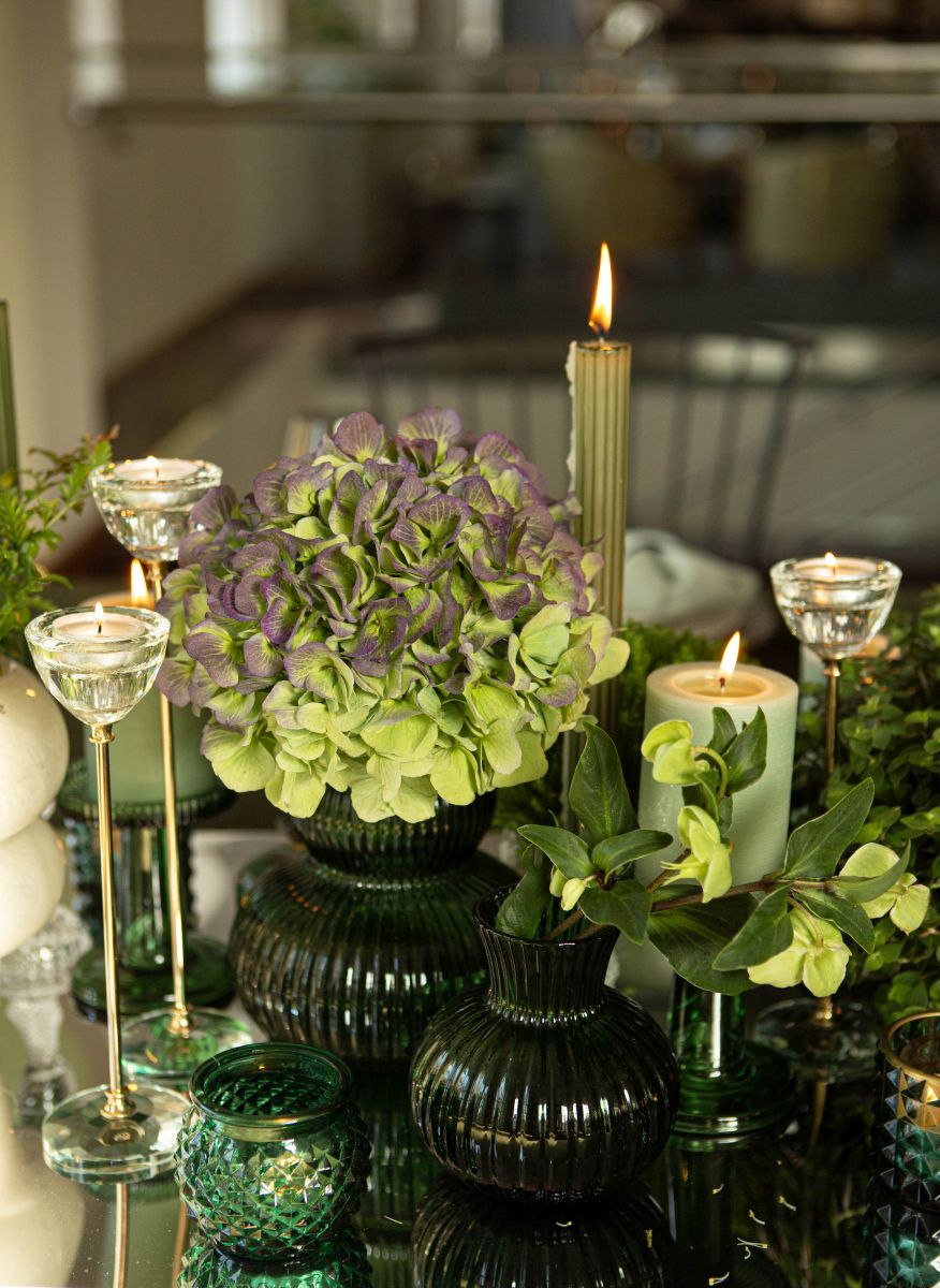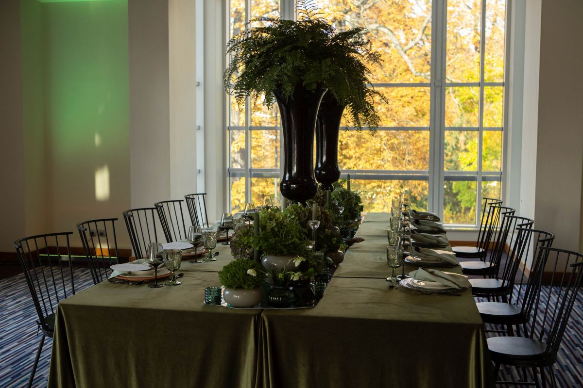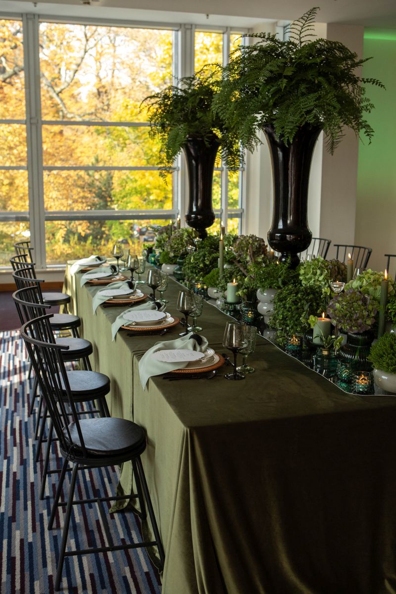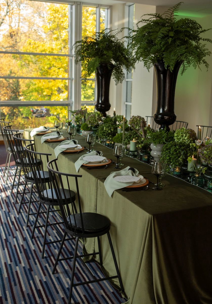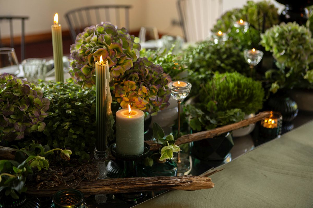 Centralną część stołu wypełniają bujne aranżacje z hortensji, kilku odmian paproci i zieleni ciętej, przeplatane świecami w odcieniach szałwii i oliwki, umieszczonymi w eleganckich świecznikach. Akcenty z naturalnego drewna i szkła podkreślają organiczny charakter całości, a wysmukłe wazony z paprociami nadają kompozycji lekkości i wysokości, przyciągając wzrok gości.