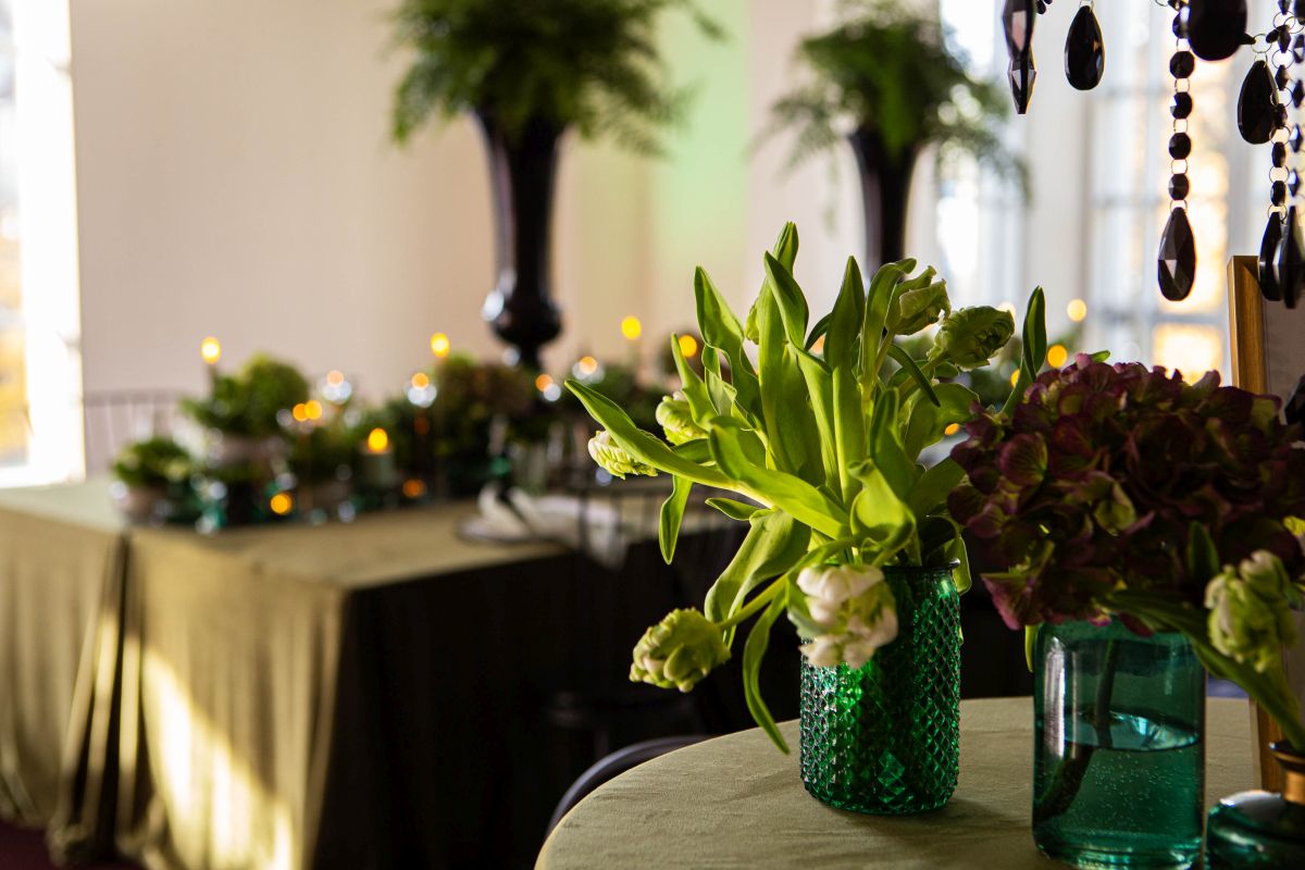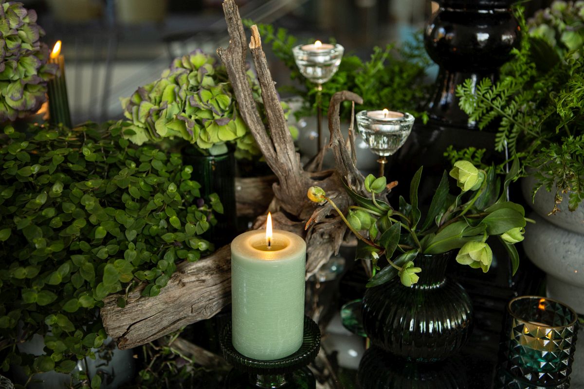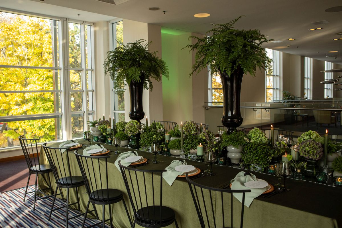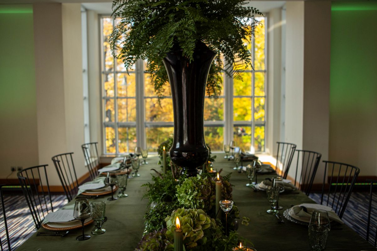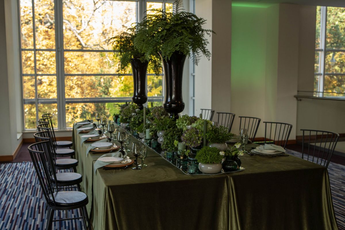 Centralną część stołu wypełniają bujne aranżacje z hortensji, kilku odmian paproci i zieleni ciętej, przeplatane świecami w odcieniach szałwii i oliwki, umieszczonymi w eleganckich świecznikach. Akcenty z naturalnego drewna i szkła podkreślają organiczny charakter całości, a wysmukłe wazony z paprociami nadają kompozycji lekkości i wysokości, przyciągając wzrok gości.